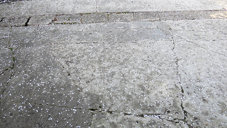当蔵玄関前のしだれ桜は今年も見事に咲きましたが、暖かで晴れの日が続いたためか、あっという間の桜吹雪にそこかしこがピンクの敷物だらけです。