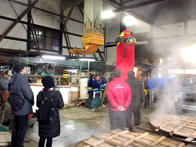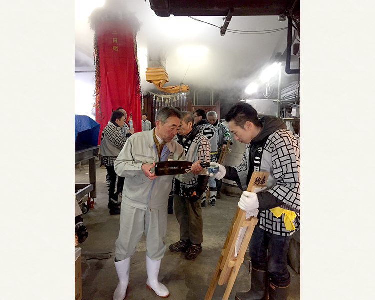 酒蔵の中では梵天唄が披露されます。唄の合間に燗酒を振る舞います。