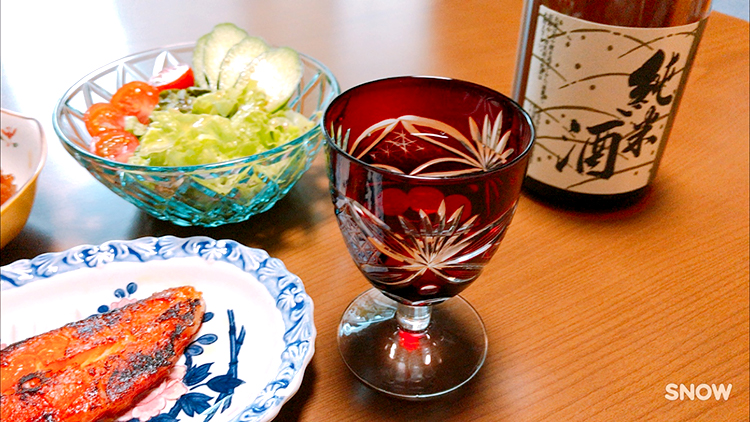 私が愛用しているのは、江戸切子の赤いグラスです。このグラス、実は結婚祝いに同僚の先輩たちからいただいたものなんです。大事に使い続けて10年…