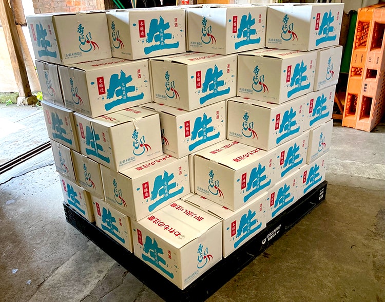 そんなお酒も例の瓢箪型の瓶に詰め、製品化する日は、なかなか体力が要ります。1日で瓶に詰める本数はなんと4,000本!私の役割は最終工程なのですが、ざっくり説明しますと、ラベルをまとった製品が間違いなく世に出せる状態にあるかどうかをチェック、箱詰めし倉庫内に納めるという工程です。