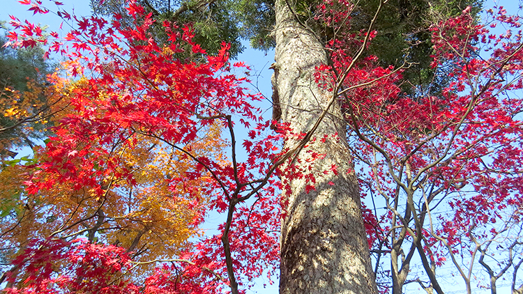 朝は落ち葉に朝露がきらきらと輝いて、夕方には西日のライトアップで色鮮やかな絨毯のように見えて、とても綺麗ですよ!