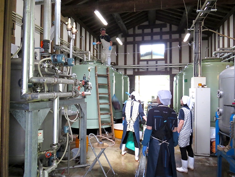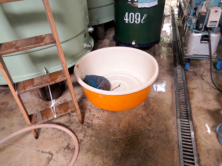 今回は2015年に仕込んだ梅酒の梅の実の引き上げです。この大きなタンクに1トン以上仕込むので、梅の実を取り出すだけでも大変な労力になります。この後よく撹拌された梅酒は、しばらく静置して澱が落ちてから、ろ過・ビン詰作業になります。