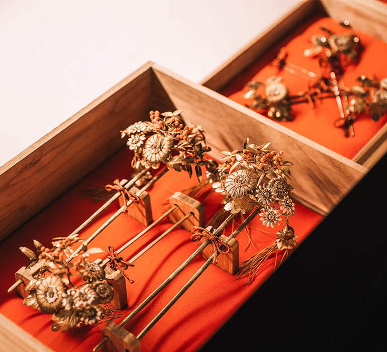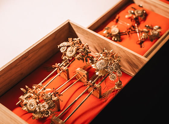 鈴木家の嫁を迎える道具として、大切に継承されてきた物です。金細工というつくりで、飾りには水晶、珊瑚が使われております。